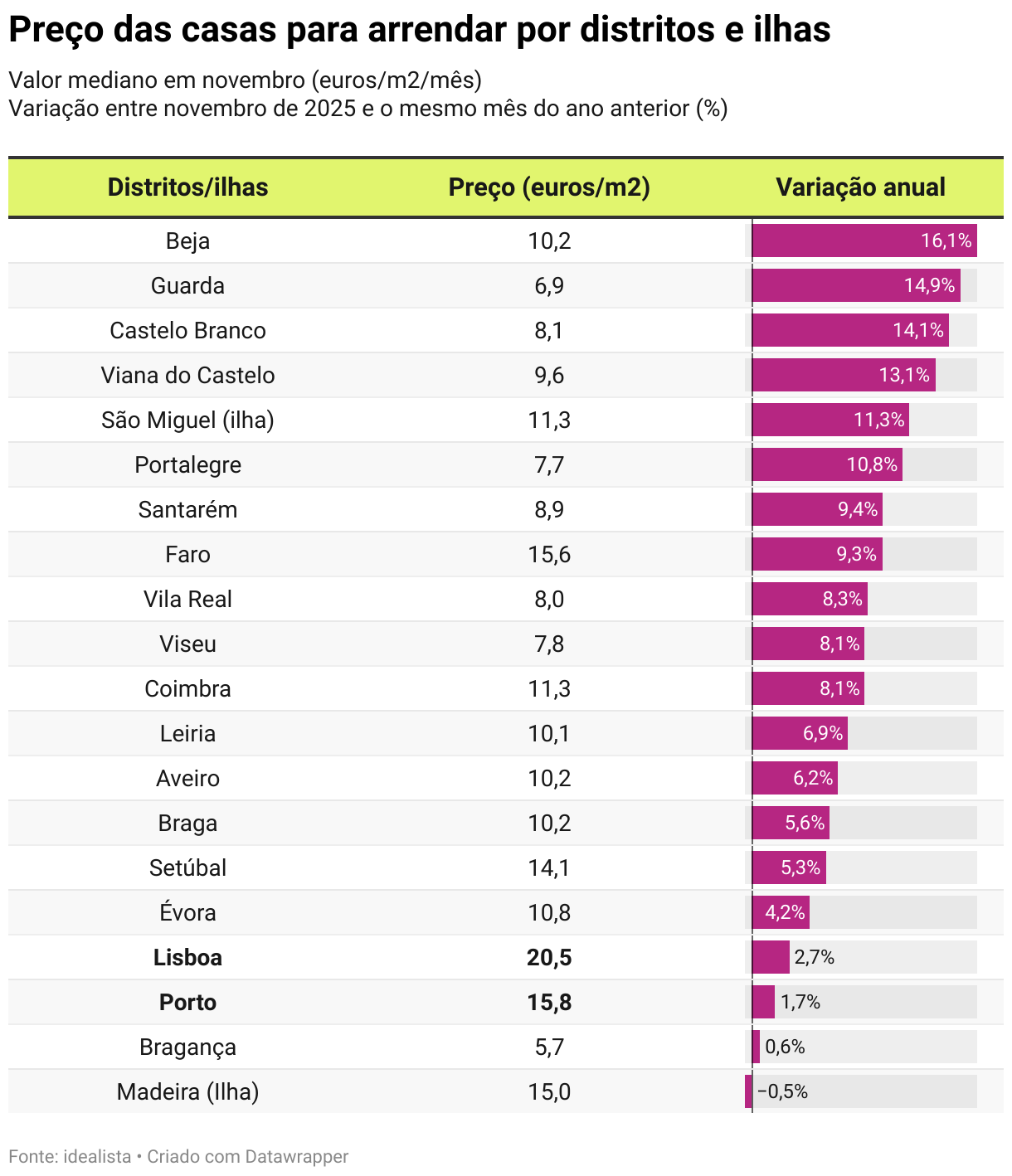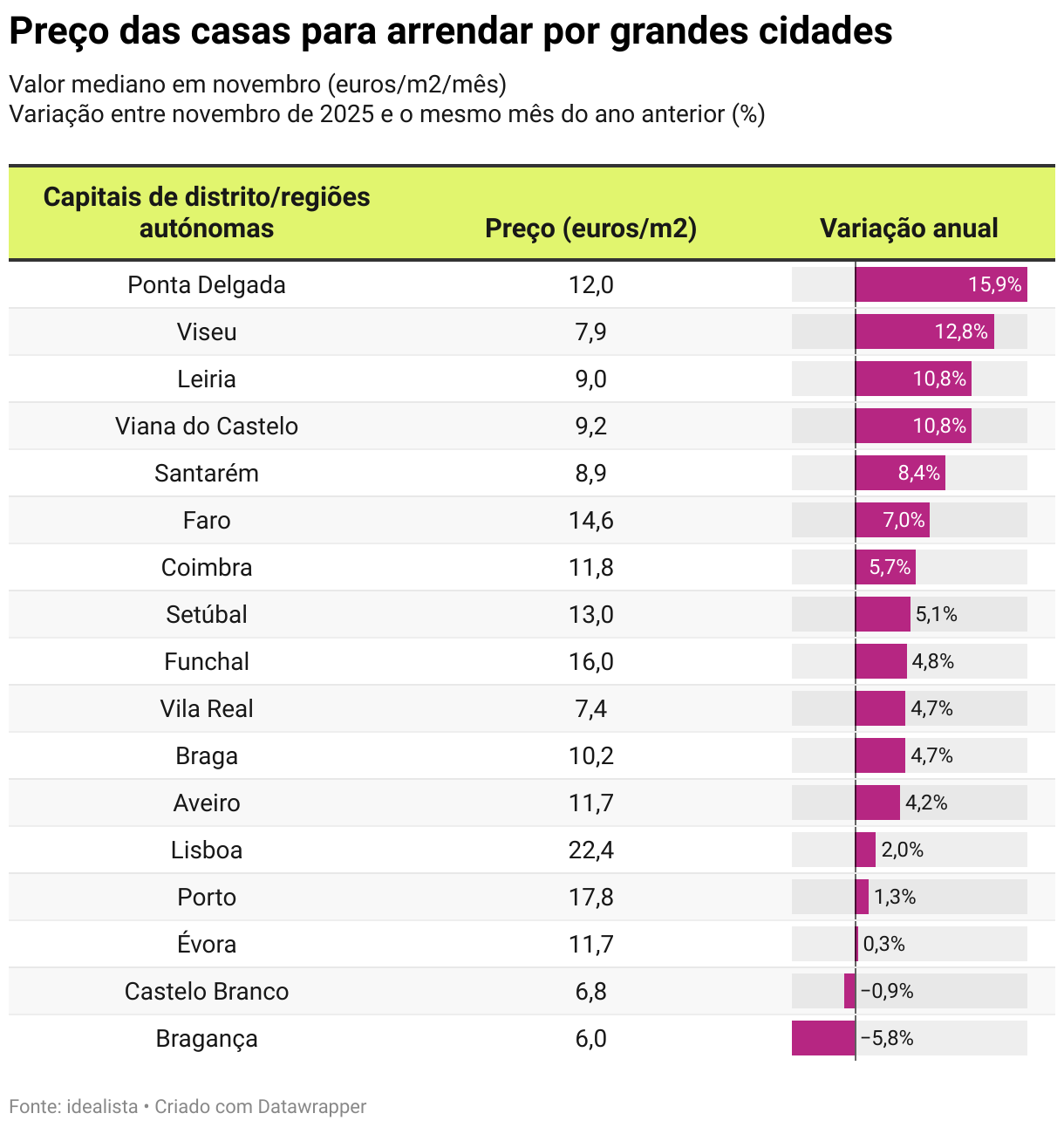 Arrendar casa em Portugal: preço perdeu ritmo de subida em novembro Lisboa, Porto, Funchal e Faro são as três cidades com as casas para arrendar mais caras no país, revela idealista. 03 dez 2025 min de leitura O mercado de arrendamento em Portugal continua resiliente, embora a pressão da procura tenha diminuído nos últimos tempos por via do aumento da oferta. Esta dinâmica recente começou a refletir-se no custo de arrendar casa no país, com os preços a desacelerar o ritmo de crescimento anual para 3,2% em novembro (menos do que os 5,7% observados no mês anterior). Os dados do índice de preços do idealista revelam ainda que, com esta evolução, arrendar casa em Portugal passou a ter um custo mediano de 16,6 euros por metro quadrado (euros/m2) no final do mês de novembro. Lisboa e Porto têm as subidas das rendas mais moderadas O preço das casas para arrendar aumentou em 15 das 17 capitais de distrito (ou de regiões autónomas) analisadas entre novembro e o mesmo mês do ano passado. Entre as cidades com maior aumento das rendas destacam-se Ponta Delgada (15,9%), Viseu (12,8%), Leiria (10,8%), Viana do Castelo (10,8%), Santarém (8,4%), Faro (7%), Coimbra (5,7%) e Setúbal (5,1%). Também se registaram aumentos no Funchal (4,8%), Braga (4,7%), Vila Real (4,7%), Aveiro (4,2%), Lisboa (2%) e Porto (1,3%). De notar ainda que as rendas das casas mantiveram-se praticamente estáveis em Évora (0,3%) e desceram em duas cidades: Bragança (-5,8%) e Castelo Branco (-0,9%). Lisboa mantém-se como a cidade mais cara para arrendar casa, com 22,4 euros/m2, seguida do Porto (17,8 euros/m2), Funchal (16 euros/m2) e Faro (14,6 euros/m2). Logo depois está Setúbal (13 euros/m2), Ponta Delgada (12 euros/m2), Coimbra (11,8 euros/m2), Évora (11,7 euros/m2) e Aveiro (11,7 euros/m2). No segmento intermédio encontram-se Braga (10,2 euros/m2), Viana do Castelo (9,2 euros/m2), Leiria (9 euros/m2) e Santarém (8,9 euros/m2). As capitais de distrito mais económicas para arrendar uma habitação continuam a ser Viseu (7,9 euros/m2), Vila Real (7,4 euros/m2) e Castelo Branco (6,8 euros/m2), além de Bragança (6 euros/m2), revelam os dados do idealista. Preço das casas para arrendar por grandes cidades Valor mediano em novembro (euros/m2/mês) Variação entre novembro de 2025 e o mesmo mês do ano anterior (%) Table with 3 columns and 17 rows. (column headers with buttons are sortable) Capitais de distrito/regiões autónomas Preço (euros/m2) Variação anual Ponta Delgada 12,0 15,9% 15,9% 15,9% Viseu 7,9 12,8% 12,8% 12,8% Leiria 9,0 10,8% 10,8% 10,8% Viana do Castelo 9,2 10,8% 10,8% 10,8% Santarém 8,9 8,4% 8,4% 8,4% Faro 14,6 7,0% 7,0% 7,0% Coimbra 11,8 5,7% 5,7% 5,7% Setúbal 13,0 5,1% 5,1% 5,1% Funchal 16,0 4,8% 4,8% 4,8% Vila Real 7,4 4,7% 4,7% 4,7% Braga 10,2 4,7% 4,7% 4,7% Aveiro 11,7 4,2% 4,2% 4,2% Lisboa 22,4 2,0% 2,0% 2,0% Porto 17,8 1,3% 1,3% 1,3% Évora 11,7 0,3% 0,3% 0,3% Castelo Branco 6,8 −0,9% −0,9% −0,9% Bragança 6,0 −5,8% −5,8% −5,8% Fonte: idealistaDescarregar estes dadosIncorporar Descarregar imagemCriado com Datawrapper Arrendamento mais caro a nível distrital Dos 20 distritos e ilhas analisados, os preços das casas para arrendar subiram em 19 e mantiveram-se praticamente estáveis na ilha da Madeira (-0,5%), mostram os dados do idealista. As maiores subidas anuais das rendas das casas registaram-se em Beja (16,1%), Guarda (14,9%), Castelo Branco (14,1%), Viana do Castelo (13,1%), ilha de São Miguel (11,3%), Portalegre (10,8%), Santarém (9,4%), Faro (9,3%), Vila Real (8,3%), Coimbra (8,1%) e Viseu (8,1%). Seguem-se aumentos em Leiria (6,9%), Aveiro (6,2%), Braga (5,6%), Setúbal (5,3%), Évora (4,2%), Lisboa (2,7%), Porto (1,7%) e Bragança (0,6%). No ranking dos distritos e ilhas mais caras para arrendar casa, Lisboa lidera com 20,5 euros/m2, seguida do Porto (15,8 euros/m2), Faro (15,6 euros/m2), ilha da Madeira (15,0 euros/m2), Setúbal (14,1 euros/m2), Coimbra (11,3 euros/m2), ilha de São Miguel (11,3 euros/m2), Évora (10,8 euros/m2), Beja (10,2 euros/m2), Aveiro (10,2 euros/m2) e Braga (10,2 euros/m2). Logo depois surgem Leiria (10,1 euros/m2) e Viana do Castelo (9,6 euros/m2). Entre os mercados de arrendamento habitacional mais acessíveis encontram-se Santarém (8,9 euros/m2), Castelo Branco (8,1%), Vila Real (8 euros/m2), Viseu (7,8 euros/m2), Portalegre (7,7 euros/m2), Guarda (6,9 euros/m2) e Bragança (5,7 euros/m2). Preço das casas para arrendar por distritos e ilhas Valor mediano em novembro (euros/m2/mês) Variação entre novembro de 2025 e o mesmo mês do ano anterior (%) Table with 3 columns and 20 rows. (column headers with buttons are sortable) Distritos/ilhas Preço (euros/m2) Variação anual Beja 10,2 16,1% 16,1% 16,1% Guarda 6,9 14,9% 14,9% 14,9% Castelo Branco 8,1 14,1% 14,1% 14,1% Viana do Castelo 9,6 13,1% 13,1% 13,1% São Miguel (ilha) 11,3 11,3% 11,3% 11,3% Portalegre 7,7 10,8% 10,8% 10,8% Santarém 8,9 9,4% 9,4% 9,4% Faro 15,6 9,3% 9,3% 9,3% Vila Real 8,0 8,3% 8,3% 8,3% Viseu 7,8 8,1% 8,1% 8,1% Coimbra 11,3 8,1% 8,1% 8,1% Leiria 10,1 6,9% 6,9% 6,9% Aveiro 10,2 6,2% 6,2% 6,2% Braga 10,2 5,6% 5,6% 5,6% Setúbal 14,1 5,3% 5,3% 5,3% Évora 10,8 4,2% 4,2% 4,2% Lisboa 20,5 2,7% 2,7% 2,7% Porto 15,8 1,7% 1,7% 1,7% Bragança 5,7 0,6% 0,6% 0,6% Madeira (Ilha) 15,0 −0,5% −0,5% −0,5% Fonte: idealistaDescarregar estes dadosIncorporar Descarregar imagemCriado com Datawrapper Rendas das casas na Madeira caem ligeiramente Os preços das casas para arrendar subiram em seis das sete regiões portuguesas no último ano terminado em novembro, registando-se apenas uma descida na Região Autónoma da Madeira (-0,8%). As maiores subidas anuais das rendas das casas verificaram-se no Alentejo (9,8%), seguido do Algarve (9,3%), Centro (8%), Região Autónoma dos Açores (7,4%), Área Metropolitana de Lisboa (2,7%) e Norte (1,4%). A Área Metropolitana de Lisboa mantém-se como a região mais cara do país para arrendar casa, com 19,8 euros/m2,