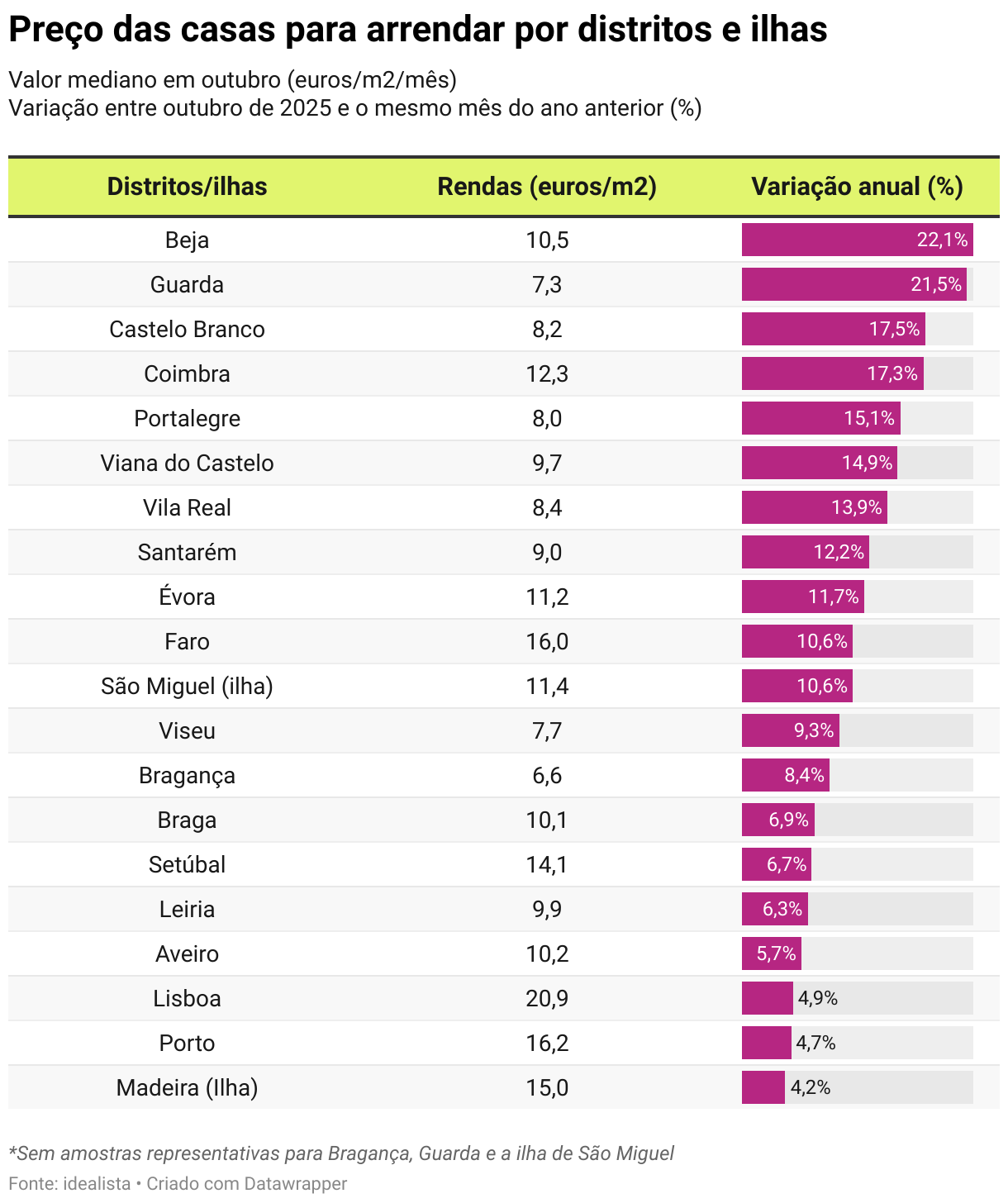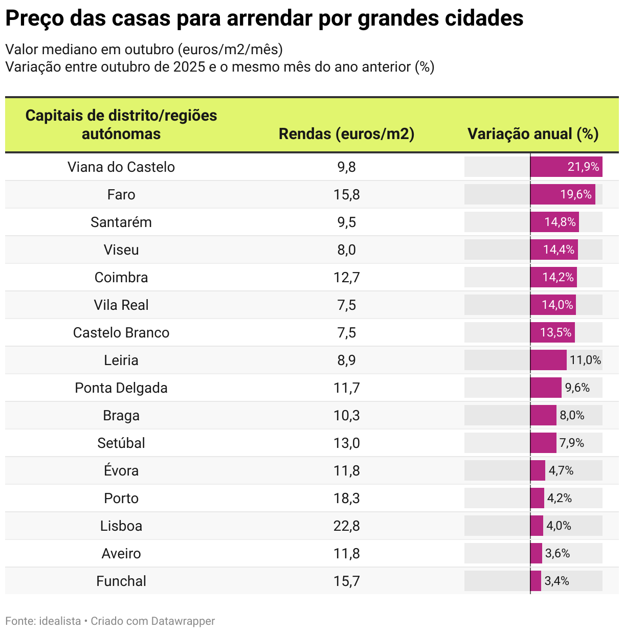 Arrendar casa em Portugal: preços aceleram subida para 5,7% em outubro Rendas das casas subiram em todas as grandes cidades, distritos e regiões do país, embora com ritmos distintos, revela idealista. 04 nov 2025 min de leitura A procura por casas para arrendar em Portugal permanece elevada, embora esteja hoje mais distribuída por uma maior oferta existente. Ainda assim, as rendas não param de aumentar. No último ano terminado em outubro, as rendas das casas subiram 5,7% tendo acelerado face ao crescimento anual registado no mês anterior (4,1%). Esta evolução colocou o custo mediano de arrendar casa no país num novo máximo de 17 euros por metro quadrado (euros/m2) no final do mês passado, revela o índice de preços do idealista. A tendência de subida das rendas mantém-se em todo o território nacional, embora com ritmos distintos entre regiões, distritos e capitais. Rendas mais caras em todas as grandes cidades…. O preço das casas para arrendar subiu em todas as 16 capitais de distrito e regiões autónomas analisadas. As maiores variações registaram-se em Viana do Castelo (21,9%), Faro (19,6%), Santarém (14,8%), Viseu (14,4%), Coimbra (14,2%), Vila Real (14%), Castelo Branco (13,5%) e Leiria (11%). Com subidas do custo da habitação para arrendar inferiores a dois dígitos estão cidades como: Ponta Delgada (9,6%), Braga (8%), Setúbal (7,9%), Évora (4,7%), Porto (4,2%), Lisboa (4%), Aveiro (3,6%) e Funchal (3,4%). Lisboa continua a ser a cidade onde é mais caro arrendar casa, com 22,8 euros/m2, seguida do Porto (18,3 euros/m2), Faro (15,8 euros/m2) e Funchal (15,7 euros/m2). A seguir surgem Setúbal (13 euros/m2), Coimbra (12,7 euros/m2), Évora (11,8 euros/m2), Aveiro (11,8 euros/m2) e Ponta Delgada (11,7 euros/m2). Entre as cidades com preços intermédios encontram-se Braga (10,3 euros/m2), Viana do Castelo (9,8 euros/m2), Santarém (9,5 euros/m2) e Leiria (8,9 euros/m2). Já as cidades mais económicas para arrendar uma habitação são Viseu (8 euros/m2), Vila Real (7,5 euros/m2) e Castelo Branco (7,5 euros/m2). Preço das casas para arrendar por grandes cidades Valor mediano em outubro (euros/m2/mês) Variação entre outubro de 2025 e o mesmo mês do ano anterior (%) Table with 3 columns and 16 rows. (column headers with buttons are sortable) Capitais de distrito/regiões autónomas Rendas (euros/m2) Variação anual (%) Viana do Castelo 9,8 21,9% 21,9% 21,9% Faro 15,8 19,6% 19,6% 19,6% Santarém 9,5 14,8% 14,8% 14,8% Viseu 8,0 14,4% 14,4% 14,4% Coimbra 12,7 14,2% 14,2% 14,2% Vila Real 7,5 14,0% 14,0% 14,0% Castelo Branco 7,5 13,5% 13,5% 13,5% Leiria 8,9 11,0% 11,0% 11,0% Ponta Delgada 11,7 9,6% 9,6% 9,6% Braga 10,3 8,0% 8,0% 8,0% Setúbal 13,0 7,9% 7,9% 7,9% Évora 11,8 4,7% 4,7% 4,7% Porto 18,3 4,2% 4,2% 4,2% Lisboa 22,8 4,0% 4,0% 4,0% Aveiro 11,8 3,6% 3,6% 3,6% Funchal 15,7 3,4% 3,4% 3,4% Fonte: idealistaDescarregar estes dadosIncorporar Descarregar imagemCriado com Datawrapper … e em todos os distritos e ilhas Dos 20 distritos e ilhas analisadas, os preços das casas para arrendar subiram em todos os territórios, sem exceção, no último ano terminado em outubro. As maiores subidas das rendas foram observadas em Beja (22,1%), Guarda (21,5%), Castelo Branco (17,5%) Coimbra (17,3%) e Portalegre (15,1%). As casas para arrendar também ficaram mais caras em Viana do Castelo (14,9%), Vila Real (13,9%), Santarém (12,2%), Évora (11,7%), ilha de São Miguel (10,6%), Faro (10,6%), Viseu (9,3%), Bragança (8,4%), Braga (6,9%), Setúbal (6,7%), Leiria (6,3%), Aveiro (5,7%), Lisboa (4,9%), Porto (4,7%) e ilha da Madeira (4,2%). No ranking dos distritos e ilhas mais caras para arrendar casa, Lisboa lidera com 20,9 euros/m2, seguida pelo Porto (16,2 euros/m2), Faro (16 euros/m2), Madeira (15 euros/m2), Setúbal (14,1 euros/m2), Coimbra (12,3 euros/m2), São Miguel (11,4 euros/m2), Évora (11,2 euros/m2) e Beja (10,5 euros/m2). Logo depois surgem Aveiro (10,2 euros/m2), Braga (10,1 euros/m2), Leiria (9,9 euros/m2), Viana do Castelo (9,7 euros/m2) e Santarém (9 euros/m2). As localizações mais económicas para arrendar uma habitação são Vila Real (8,4 euros/m2), Castelo Branco (8,2 euros/m2), Portalegre (8 euros/m2), Viseu (7,7 euros/m2) e Guarda (7,3 euros/m2), seguida por Bragança (6,6 euros/m2), que continua a ser o mercado mais acessível do país. Preço das casas para arrendar por distritos e ilhas Valor mediano em outubro (euros/m2/mês) Variação entre outubro de 2025 e o mesmo mês do ano anterior (%) Table with 3 columns and 20 rows. (column headers with buttons are sortable) Distritos/ilhas Rendas (euros/m2) Variação anual (%) Beja 10,5 22,1% 22,1% 22,1% Guarda 7,3 21,5% 21,5% 21,5% Castelo Branco 8,2 17,5% 17,5% 17,5% Coimbra 12,3 17,3% 17,3% 17,3% Portalegre 8,0 15,1% 15,1% 15,1% Viana do Castelo 9,7 14,9% 14,9% 14,9% Vila Real 8,4 13,9% 13,9% 13,9% Santarém 9,0 12,2% 12,2% 12,2% Évora 11,2 11,7% 11,7% 11,7% Faro 16,0 10,6% 10,6% 10,6% São Miguel (ilha) 11,4 10,6% 10,6% 10,6% Viseu 7,7 9,3% 9,3% 9,3% Bragança 6,6 8,4% 8,4% 8,4% Braga 10,1 6,9% 6,9% 6,9% Setúbal 14,1 6,7% 6,7% 6,7% Leiria 9,9 6,3% 6,3% 6,3% Aveiro 10,2 5,7% 5,7% 5,7% Lisboa 20,9 4,9% 4,9% 4,9% Porto 16,2 4,7% 4,7% 4,7% Madeira (Ilha) 15,0 4,2% 4,2% 4,2% *Sem amostras representativas para Bragança, Guarda e a ilha de São Miguel Fonte: idealistaDescarregar estes dadosIncorporar Descarregar imagemCriado com Datawrapper Alentejo tem maior subida das rendas entre regiões Os preços das casas para arrendar subiram em todas as regiões de Portugal no último ano. As maiores variações anuais registaram-se no Alentejo (16,1%), seguido do Centro (11,3%), Região Autónoma dos Açores (10,9%), Algarve (10,6%), Norte (4,9%), Área Metropolitana de Lisboa (4,9%) e Região Autónoma da Madeira (4,5%). No que diz respeito aos preços do arrendamento, a Área Metropolitana de Lisboa mantém-se como a região mais cara do país, com 20,2 euros/m2, seguida do Algarve (16 euros/m2)