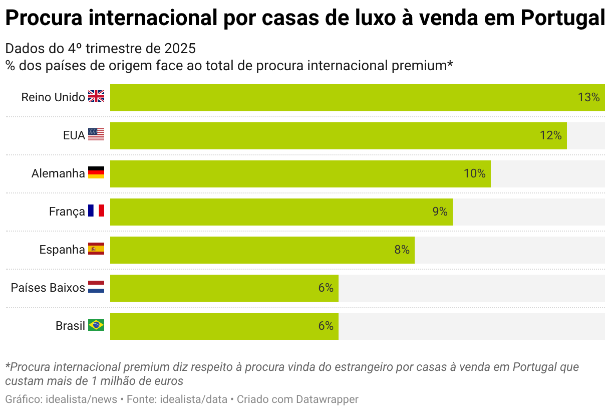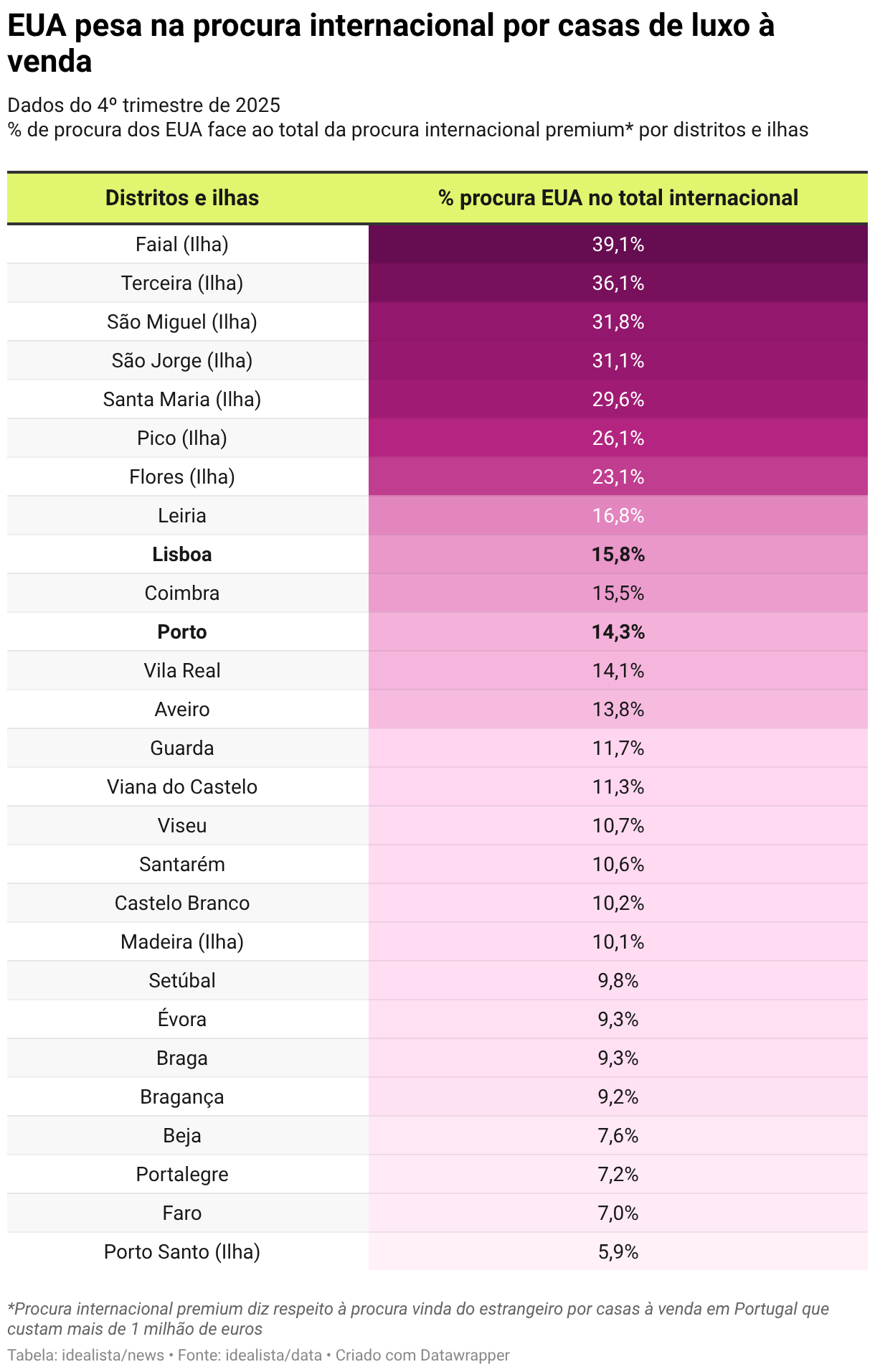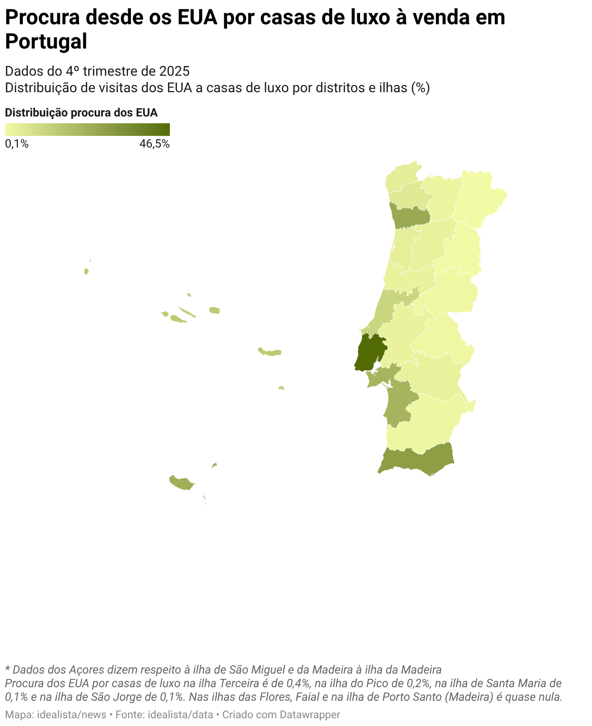 Geral O ‘efeito Trump’ na procura de casa de luxo em Portugal desde os EUA Procura dos EUA por habitação premium está de pedra e cal no país. Lisboa, Faro e Porto são cidades preferidas, revela idealista. 29 jan 2026 min de leitura Hoje, quem vive nos EUA tem uma perceção de risco ampliada devido a várias decisões tomadas por Donald Trump, presidente do país, desde as novas tarifas às mudanças nas políticas de imigração, passando pelos novos conflitos internos e geopolíticos. Talvez por isso é que os norte-americanos com alto poder de compra continuam a procurar refúgios para viver e investir, como é o caso de Portugal. Os dados mais recentes do idealista revelam que a procura desde os EUA por casas de luxo à venda em Portugal continua bem expressiva, apesar de haver menos incentivos fiscais para investimento imobiliário no nosso país. A política interna e externa dos EUA tem sido abalada pela adoção de várias medidas tomadas durante o primeiro ano do novo mandato presidencial de Donald Trump. A nível interno, os norte-americanos têm sentido os efeitos da sua dura política de imigração, que resultou em 605.000 deportações no último ano, e estão a assistir à grande pressão exercida sobre a Reserva Federal para reduzir as taxas de juro. A nível externo, destaca-se a aplicação de duras tarifas a vários países do mundo – União Europeia incluída - e a captura do presidente da Venezuela, Nicolás Maduro, no início deste ano, a par do escalar de tensões com o Irão. É neste contexto de instabilidade com epicentro nos EUA que as famílias e investidores norte-americanos – nomeadamente, os que têm elevado poder de compra - tendem a procurar refúgios para viver e investir. E, ao que tudo indica, Portugal continua a ser uma opção para estes investidores estrangeiros vindos dos EUA, perante a sua posição estratégia, políticas fiscais favoráveis e baixa criminalidade, além do clima ameno. Procura internacional por casas de luxo à venda em Portugal Dados do 4º trimestre de 2025 % dos países de origem face ao total de procura internacional premium* Reino Unido 13% EUA 12% Alemanha 10% França 9% Espanha 8% Países Baixos 6% Brasil 6% *Procura internacional premium diz respeito à procura vinda do estrangeiro por casas à venda em Portugal que custam mais de 1 milhão de euros Gráfico: idealista/newsFonte: idealista/dataDescarregar estes dadosIncorporar Descarregar imagemCriado com Datawrapper Os dados mais recentes do idealista/data revelam que quem vive nos EUA continua a procurar ativamente casas de luxo à venda em Portugal, que custam mais de um milhão de euros. No último trimestre de 2025, os EUA representaram mesmo 12% do total da procura internacional por este tipo de imóveis premium no nosso país, sendo a segunda nacionalidade com o peso mais expressivo, estando apenas atrás do Reino Unido (país que representa 13% do total da procura internacional). E, note-se, que este interesse continua apesar de os vistos gold para investimento imobiliário em Portugal terem terminado no final de 2023. A presença de potenciais compradores norte-americanos com alto poder de compra em Portugal pode, assim, estar a ser alimentada pelas atuais tensões geopolíticas e económicas nos EUA, provocadas por Trump, mas não só. Também Zohran Mamdani, o novo presidente da câmara de Nova Iorque, prometeu intervir no mercado habitacional da capital financeira do mundo, congelando rendas e introduzindo mais impostos sobre cidadãos com maiores salários. Donald Trump, Presidente dos EUA, e Zohran Mamdani, o novo presidente da câmara de Nova IorqueGetty images Onde há mais casas de luxo visitadas desde os EUA? Neste contexto internacional desafiante, Portugal parece estar, assim, a reforçar a sua posição enquanto país estável e seguro para investir em imobiliário premium aos olhos de quem está nos EUA. Mas onde é que procuram mais casas de luxo à venda no nosso país? Lisboa é mesmo o distrito que desperta mais interesse a quem procura uma habitação premium para comprar desde os EUA (46,5%), seguido por Faro (16,1%) e Porto (9,4%) Estes três distritos, juntos, concentram mesmo 72% da procura por casas de luxo vinda dos EUA. Já a ilha da Madeira (6,1%), Setúbal (5,6%), a ilha de São Miguel (3,9%) e Leiria (3%) apresentam um peso moderado no total de visitas a casas de luxo desde os EUA, mostram os mesmos dados do idealista/data referentes ao último trimestre de 2025. Além destes territórios, Braga, Viana do Castelo e Aveiro são os únicos distritos que apresentam um peso da procura norte-americana por casas premium acima de 1%, sendo diminuto e pouco expressivo nos restantes distritos do país. Procura desde os EUA por casas de luxo à venda em Portugal Dados do 4º trimestre de 2025 Distribuição de visitas dos EUA a casas de luxo por distritos e ilhas (%) Distribuição procura dos EUA 0,1%46,5% * Dados dos Açores dizem respeito à ilha de São Miguel e da Madeira à ilha da Madeira Procura dos EUA por casas de luxo na ilha Terceira é de 0,4%, na ilha do Pico de 0,2%, na ilha de Santa Maria de 0,1% e na ilha de São Jorge de 0,1%. Nas ilhas das Flores, Faial e na ilha de Porto Santo (Madeira) é quase nula. Mapa: idealista/newsFonte: idealista/dataDescarregar estes dadosIncorporar Descarregar imagemCriado com Datawrapper EUA alimenta procura estrangeira premium nos Açores As visitas aos imóveis de luxo em Portugal desde os EUA também continuam a alimentar a procura internacional premium em várias zonas do país, com destaque para as ilhas do arquipélago dos Açores, o que pode ser explicado pela proximidade geográfica e ligações históricas. Os EUA representam mesmo 39,1% do total de visitas estrangeiras a casas de luxo na ilha do Faial. E pesam 36,1% na procura internacional de habitações premium na ilha Terceira, onde os EUA têm instalada a base área militar das Lajes há vários anos. Também na ilhas de
