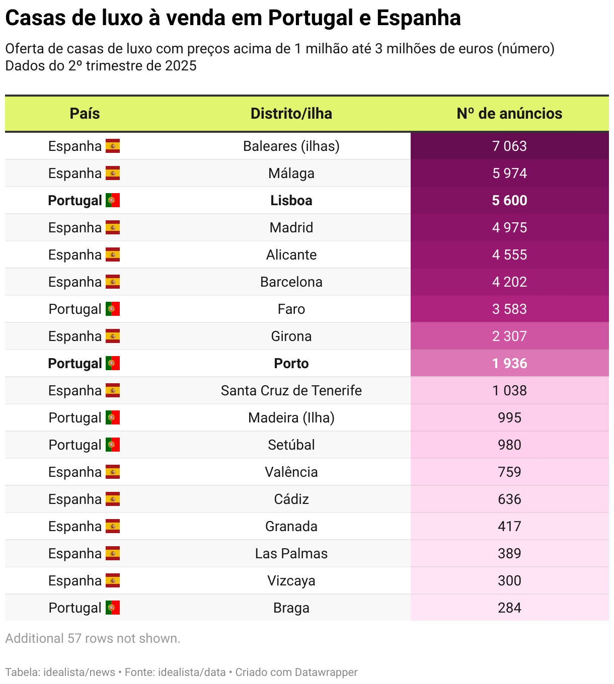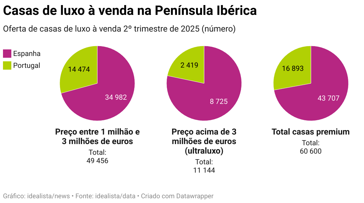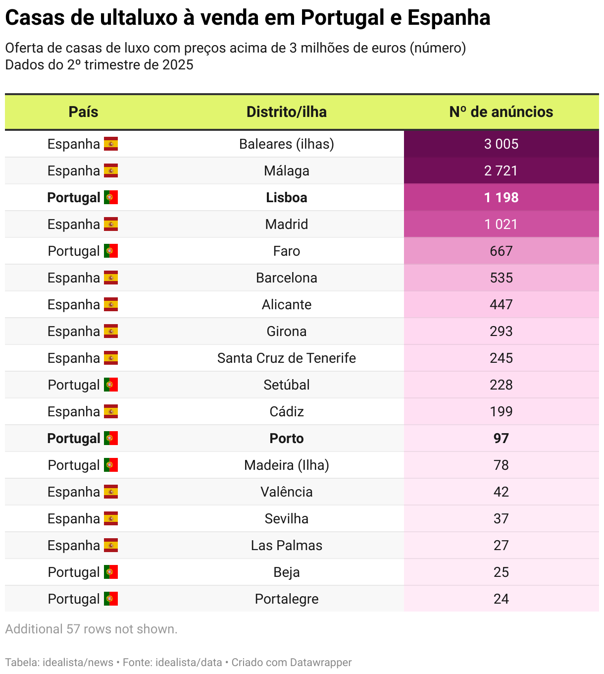 Também há falta de casas de ultraluxo à venda em Portugal e Espanha? Contam-se milhares de casas premium para comprar no mercado ibérico. Mas só 18% é realmente habitação de topo, revela idealista. 13 nov 2025 min de leitura O imobiliário continua a ser um dos principais ativos refúgio para investidores e famílias com alto poder de compra. Mas quem procura casas de ultraluxo em Portugal e Espanha para comprar vai encontrar uma oferta pequena e concentrada em apenas alguns territórios, com destaque para Lisboa no mercado nacional e Madrid, ilhas Baleares e Málaga, no país vizinho. Os dados do idealista revelam que as habitações de ultraluxo, que custam mais de 3 milhões de euros, representam apenas 18% da oferta residencial premium existente na Península Ibérica. No final do segundo trimestre de 2025, havia cerca 60 mil habitações de alta gama à venda por mais de 1 milhão de euros no espaço ibérico, revelando uma distribuição desigual, desde logo, nos dois lados da fronteira. Isto porque apenas uma em cada quatro casas de luxo se situava em Portugal, estando a grande maioria localizada em Espanha (72%). Casas de luxo à venda na Península Ibérica Oferta de casas de luxo à venda 2º trimestre de 2025 (número) Espanha Portugal 34 982 14 474 Preço entre 1 milhão e 3 milhões de euros Total:49 456 8 725 2 419 Preço acima de 3 milhões de euros (ultraluxo) Total:11 144 43 707 16 893 Total casas premium Total:60 600 Gráfico: idealista/newsFonte: idealista/dataIncorporar Descarregar imagemCriado com Datawrapper Dentro deste mercado exclusivo da Península Ibérica, o universo de casas de ultraluxo demonstra ser pequeno, tendo em conta a análise dos mesmos dados do idealista/data. Isto porque, neste período, havia pouco mais de 11 mil habitações à venda por mais de 3 milhões de euros, o equivalente a 18% do total da oferta premium contabilizada nos países irmãos. Mais de 90% da oferta de casas de ultraluxo está concentrada em apenas 10 territórios ibéricos. Em primeiro lugar estão as ilhas Baleares, com cerca de 3 mil habitações à venda, seguida de Málaga (2.271), Lisboa (1.198) e Madrid (1.021). O top 10 segue com Faro, Barcelona, Alicante, Girona, Santa Cruz de Tenerife e Setúbal. O distrito do Porto aparece na 12ª posição com apenas 97 habitações ultrapremium no mercado. Esta distribuição heterogénea das casas de ultraluxo à venda é bem visível no mapa ibérico, uma vez mais porque Espanha reúne a maioria da oferta (78%). Além disso, em cinco ilhas portuguesas e nove províncias espanholas não se registou um único imóvel no mercado neste patamar de valores. E 34 territórios portugueses e espanhóis revelam ter uma oferta inferior a 10 casas com preços acima de 3 milhões de euros no mercado. Casas de ultaluxo à venda em Portugal e Espanha Oferta de casas de luxo com preços acima de 3 milhões de euros (número) Dados do 2º trimestre de 2025 Página 1 de 5 Table with 3 columns and 75 rows. Currently displaying rows 1 to 18. (column headers with buttons are sortable) País Distrito/ilha Nº de anúncios Espanha Baleares (ilhas) 3 005 Espanha Málaga 2 721 Portugal Lisboa 1 198 Espanha Madrid 1 021 Portugal Faro 667 Espanha Barcelona 535 Espanha Alicante 447 Espanha Girona 293 Espanha Santa Cruz de Tenerife 245 Portugal Setúbal 228 Espanha Cádiz 199 Portugal Porto 97 Portugal Madeira (Ilha) 78 Espanha Valência 42 Espanha Sevilha 37 Espanha Las Palmas 27 Portugal Beja 25 Portugal Portalegre 24 Tabela: idealista/newsFonte: idealista/dataDescarregar estes dadosIncorporar Descarregar imagemCriado com Datawrapper Portanto, os dados do idealista/data revelam que a grande maioria das casas premium à venda em Portugal e Espanha estão no patamar de preços entre 1 milhão e 3 milhões de euros (quase 50 mil imóveis, representando 82% do stock total de luxo). E os territórios que reúnem maior oferta voltam a ser as ilhas Baleares, Málaga, Lisboa e Madrid. Neste intervalo de preços de luxo, verifica-se que praticamente todos os territórios ibéricos possuem, pelo menos, uma casa anunciada que custa mais de um milhão de euros até 3 milhões - a única exceção é Zamora, em Espanha. Mas continua-se a observar uma distribuição de casas de luxo heterogénea, estando mais concentrada nas capitais (Lisboa e Madrid), noutras grandes cidades (como Porto e Barcelona) e zonas turísticas de renome (como Faro e ilhas Baleares, por exemplo). Casas de luxo à venda em Portugal e Espanha Oferta de casas de luxo com preços acima de 1 milhão até 3 milhões de euros (número) Dados do 2º trimestre de 2025 Página 1 de 5 Table with 3 columns and 75 rows. Currently displaying rows 1 to 18. (column headers with buttons are sortable) País Distrito/ilha Nº de anúncios Espanha Baleares (ilhas) 7 063 Espanha Málaga 5 974 Portugal Lisboa 5 600 Espanha Madrid 4 975 Espanha Alicante 4 555 Espanha Barcelona 4 202 Portugal Faro 3 583 Espanha Girona 2 307 Portugal Porto 1 936 Espanha Santa Cruz de Tenerife 1 038 Portugal Madeira (Ilha) 995 Portugal Setúbal 980 Espanha Valência 759 Espanha Cádiz 636 Espanha Granada 417 Espanha Las Palmas 389 Espanha Vizcaya 300 Portugal Braga 284 Tabela: idealista/newsFonte: idealista/dataDescarregar estes dadosIncorporar Descarregar imagemCriado com Datawrapper Fonte: Ultraluxo pesa 18% das casas exclusivas à venda em Portugal e Espanha — idealista/news Partilhar artigo FacebookXPinterestWhatsAppCopiar link Link copiado