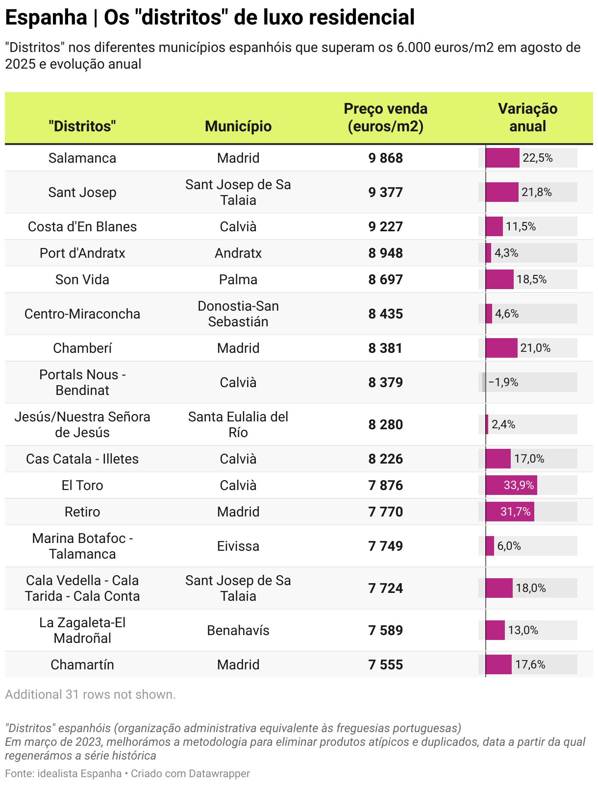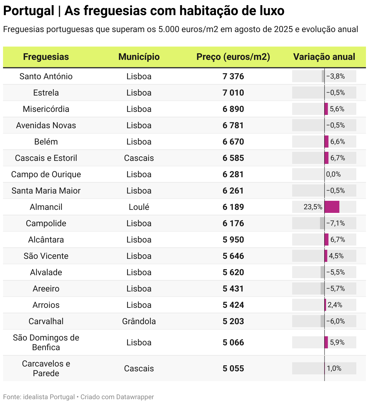 Onde estão as casas de luxo em Portugal, Espanha e Itália Estas são as zonas das grandes cidades de Portugal, Espanha e Itália que têm os preços das casas mais caros, segundo o idealista. 06 out 2025 min de leitura O mercado residencial de luxo continua em alta em Portugal, Espanha e Itália, embora sejam visíveis algumas diferenças nas tendências dos preços das casas ao longo do último ano. Lisboa, Madrid e Milão destacam-se por terem as principais zonas urbanas com casas de luxo à venda, evidenciado os preços mais elevados. Mas não são os únicos polos habitacionais premium nestes três países. Para compreender como está a mexer o mercado de luxo, analisámos as zonas dos vários municípios do Sul da Europa que têm os preços das casas à venda mais elevados, tendo por base os dados de agosto de 2025 revelados pelos índices de preços do idealista, Marketplace imobiliário do Sul da Europa. Lisboa monopoliza o mercado residencial de luxo em Portugal Em Portugal, Lisboa lidera e domina o mercado habitacional de luxo. Todas as 14 freguesias lisboetas apresentam preços medianos das casas acima de 5.000 euros por metro quadrado (euros/m2). É a freguesia de Santo António que tem o metro quadrado (m2) mais caro do país e da capital (7.376 euros), seguida pela Estrela (7.010 euros) e pela Misericórdia (6.890 euros). As outras 11 freguesias de Lisboa também se destacam entre as mais caras do país, como as Avenidas Novas (6.781 euros/m2), Belém (6.670 euros/m2), Campo de Ourique (6.281 euros/m2) e Santa Maria Maior (6.261 euros/m2). Fora do município lisboeta, destaca-se ainda a freguesia de Cascais e Estoril, com preços das casas a atingir um novo máximo histórico de 6.585 euros/m2, depois de terem subido 6,7% no último ano. Nesta lista também está a freguesia vizinha de Carcavelos e Parede (5.055 euros/m2). As 14 freguesias de Lisboa encontram-se entre as mais caras do paísidealista No sul do país, a freguesia de Almancil, município de Loulé, aparece entre as mais caras de todas, com os preços das casas à venda a chegar aos 6.189 euros/m2. E destaca-se ainda por ter registado o maior aumento do custo da habitação (+23,5%) entre as freguesias portuguesas mais caras em análise. Ao nível de subida dos preços, Almancil ficou à frente das freguesias lisboetas de Alcântara (6,7%), Belém (6,6%) ou São Domingos de Benfica (5,9%). Ainda assim, oito freguesias portugueses mais exclusivas registaram quedas nos preços das casas. A maior redução ocorreu em Campolide (-7,1%), em Lisboa, seguida da freguesia do Carvalhal, em Grândola (-6%). Outras quedas notáveis foram observadas em outras áreas de Lisboa, como Areeiro (-5,7%), Alvalade (-5,5%) e Santo António (-3,8%). Na Estrela, Avenidas Novas e em Santa Maria Maior os preços desceram 0,5%, enquanto em Campo de Ourique mantiveram-se estáveis no último ano. Portugal | As freguesias com habitação de luxo Freguesias portuguesas que superam os 5.000 euros/m2 em agosto de 2025 e evolução anual Table with 4 columns and 18 rows. (column headers with buttons are sortable) Freguesias Município Preço (euros/m2) Variação anual Santo António Lisboa 7 376 −3,8% −3,8% −3,8% Estrela Lisboa 7 010 −0,5% −0,5% −0,5% Misericórdia Lisboa 6 890 5,6% 5,6% 5,6% Avenidas Novas Lisboa 6 781 −0,5% −0,5% −0,5% Belém Lisboa 6 670 6,6% 6,6% 6,6% Cascais e Estoril Cascais 6 585 6,7% 6,7% 6,7% Campo de Ourique Lisboa 6 281 0,0% 0,0% 0,0% Santa Maria Maior Lisboa 6 261 −0,5% −0,5% −0,5% Almancil Loulé 6 189 23,5% 23,5% 23,5% Campolide Lisboa 6 176 −7,1% −7,1% −7,1% Alcântara Lisboa 5 950 6,7% 6,7% 6,7% São Vicente Lisboa 5 646 4,5% 4,5% 4,5% Alvalade Lisboa 5 620 −5,5% −5,5% −5,5% Areeiro Lisboa 5 431 −5,7% −5,7% −5,7% Arroios Lisboa 5 424 2,4% 2,4% 2,4% Carvalhal Grândola 5 203 −6,0% −6,0% −6,0% São Domingos de Benfica Lisboa 5 066 5,9% 5,9% 5,9% Carcavelos e Parede Cascais 5 055 1,0% 1,0% 1,0% Fonte: idealista PortugalIncorporar Descarregar imagemCriado com Datawrapper Ilhas Baleares e Madrid: os epicentros do luxo em Espanha Há vários "distritos" espanhóis (organização administrativa equivalente às freguesias portuguesas) que possuem preços medianos de casas à venda superiores a Santo António, a freguesia lisboeta que apresentou o máximo nacional (de 7.376 euros/m2). O "distrito" de Salamanca, em Madrid, está em destaque, registando o maior preço de venda de casas por metro quadrado em Espanha: chegou aos 9.868 euros/m2 em agosto, após um crescimento anual de 22,5%. Salamanca possui, aliás, os bairros residenciais mais caros do país, com preços a superar os 10.000 euros/m2 em Goya, Lista, Castellana e Recoletos. Ainda com o custo mediano habitacional acima dos 9.000 euros/m2 estão "distritos" espanhóis, como Sant Josep (em Ibiza) e Costa d'En Blanes (em Maiorca). Os preços atingiram máximos na série histórica do idealista nestas duas localizações, de 9.377 euros/m2 e 9.227 euros/m2, respetivamente. Contam-se 11 dos 13 "distritos" do município de Calvià, na ilha de Maiorca, que apresentam preços das casas à venda superiores a 6.000 euros/m2, com destaque para Portals Nous – Bendinat (8.379 euros/m2), Cas Catala – Illetes (8.226 euros/m2) e El Toro (7.876 euros/m2). Seis "distritos" de Madrid aparecem neste ranking de preços das casas de luxo mais elevados de Espanhaidealista A cidade de Madrid também se destaca com seis localizações neste ranking que reúne os "distritos" com os maiores preços das casas em Espanha. Além de Salamanca, os preços do m2 das casas estão acima de 7.000 euros em Chamberí, Retiro, Chamartín e Centro. Na vizinha Espanha, os maiores aumentos anuais dos preços das casas foram registados nos "distritos" de Sant Elm - S'Arracó (45,2%), em Andratx, e El Toro (33,9%), em Calvià (ambos os municípios localizados na ilha de Maiorca). Na zona do Retiro, em Madrid, os preços das casas ficaram 31,7% mai
