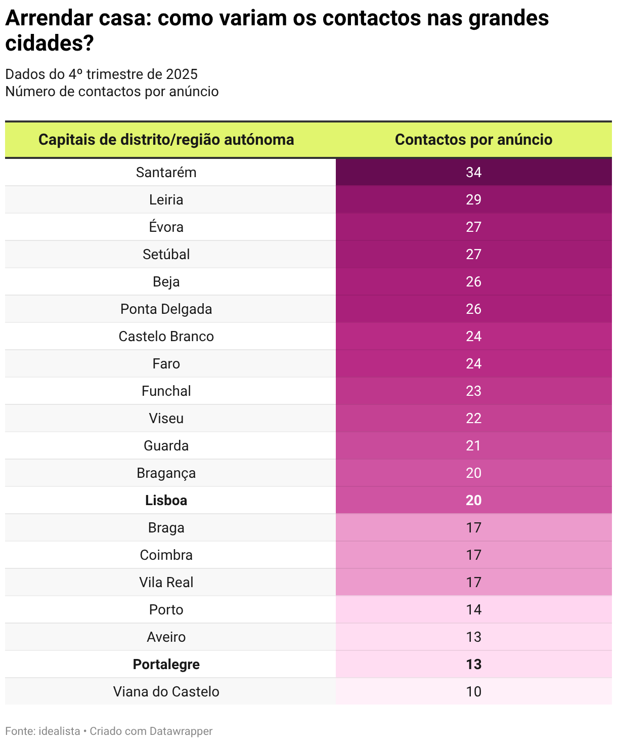 Geral Arrendar casa em Portugal: procura cresce 5% no final de 2025 Cada casa para arrendar anunciada recebeu, em média, 22 contactos. Santarém e Leiria lideram procura, revela idealista. 20 jan 2026 min de leitura O interesse por casas para arrendar em Portugal manteve-se elevado no final de 2025, perante o abrandamento da subida das rendas de 0,9% registado em dezembro. A mais recente análise do idealista revela que cada anúncio de arrendamento recebeu, em média, 22 contactos antes de ser retirado da plataforma. Houve, assim, um crescimento da procura no arrendamento de 5% entre o quarto trimestre de 2025 e o mesmo período do ano anterior. “A ligeira subida do número médio de contactos por anúncio no final de 2025, a nível nacional, confirma que a procura por habitação para arrendamento se mantém elevada. Este comportamento indica que o interesse das famílias continua forte, sem sinais de um abrandamento significativo”, analisa Ruben Marques, porta-voz do idealista, indicando que, ainda assim, “os valores das rendas continuam em patamares elevados e fora do alcance de uma parte significativa da população portuguesa.” Freepik Onde há maior procura por casas para arrendar? No quarto trimestre de 2025, as capitais de distrito (ou de regiões autónomas) que registaram maior média de contactos por anúncio de casas para arrendar foram Santarém, com 34 contactos, seguida de Leiria (29) e Évora (27) e Setúbal (27). Beja e Ponta Delgada surgem logo a seguir, com uma média de 26 contactos por anúncio. Com níveis elevados de procura no mercado de arrendamento habitacional encontram-se ainda Faro e Castelo Branco (ambos com 24 contactos por anúncio), seguidos pelo Funchal (23) e Viseu (22). Guarda registou 21 contactos, enquanto Lisboa e Bragança ficaram nos 20. Num patamar intermédio surgem Braga, Coimbra e Vila Real, onde cada casa para arrendar recebeu 17 manifestações de interesse. O Porto registou 14 contactos por anúncio e Aveiro ficou nos 13. As cidades com menor procura no arrendamento residencial no final de 2025 foram Portalegre (13) e Viana do Castelo (10), revela o idealista. Arrendar casa: como variam os contactos nas grandes cidades? Dados do 4º trimestre de 2025 Número de contactos por anúncio Table with 2 columns and 20 rows. (column headers with buttons are sortable) Capitais de distrito/região autónoma Contactos por anúncio Santarém 34 Leiria 29 Évora 27 Setúbal 27 Beja 26 Ponta Delgada 26 Castelo Branco 24 Faro 24 Funchal 23 Viseu 22 Guarda 21 Bragança 20 Lisboa 20 Braga 17 Coimbra 17 Vila Real 17 Porto 14 Aveiro 13 Portalegre 13 Viana do Castelo 10 Fonte: idealistaDescarregar estes dadosIncorporar Descarregar imagemCriado com Datawrapper Procura por arrendamento cresce em 10 grandes cidades – e cai noutras 10 Ao analisar a evolução da procura por casas para arrendar entre o final de 2025 e o mesmo período do ano anterior, salta à vista que a média de contactos por anúncio cresceu em 10 grandes cidades e desceu nas outras 10 capitais, evidenciando uma evolução desigual entre mercados. As maiores subidas anuais da procura no arrendamento habitacional foram observadas em Évora (50%), Beja (30%) e no Funchal (28%). Em destaque está ainda Viseu (22%), Leiria (21%), Castelo Branco (20%) e o Porto (17%). Os crescimentos mais moderados do interesse foram registados em Faro (9%), Ponta Delgada (8%) e Lisboa (5%). Por outro lado, o maior arrefecimento da procura de casas para arrendar foi observado em Portalegre (-63%), seguido de Aveiro (-24%), Bragança (-23%), Vila Real (-19%), Setúbal (-16%) e Coimbra (-15%). Também se registaram recuos de interesse em Viana do Castelo (-9%), Santarém (-8%), Braga (-6%) e Guarda (-5%). Evolução dos contactos por anúncio de casas para arrendar Variação entre o 4º trimestre de 2025 e o mesmo período do ano anterior (%) Table with 2 columns and 20 rows. (column headers with buttons are sortable) Capitais de distrito/região autónoma Variação dos contactos por anúncio Évora 50% 50% 50% Beja 30% 30% 30% Funchal 28% 28% 28% Viseu 22% 22% 22% Leiria 21% 21% 21% Castelo Branco 20% 20% 20% Porto 17% 17% 17% Faro 9% 9% 9% Ponta Delgada 8% 8% 8% Lisboa 5% 5% 5% Guarda −5% −5% −5% Braga −6% −6% −6% Santarém −8% −8% −8% Viana do Castelo −9% −9% −9% Coimbra −15% −15% −15% Setúbal −16% −16% −16% Vila Real −19% −19% −19% Bragança −23% −23% −23% Aveiro −24% −24% −24% Portalegre −63% −63% −63% Fonte: idealistaDescarregar estes dadosIncorporar Descarregar imagemCriado com Datawrapper Metodologia Dados recolhidos e analisados pelo idealista/data, a proptech do idealista que fornece informações destinadas a profissionais para facilitar a tomada de decisões estratégicas, em Portugal, Espanha e Itália. O idealista/data utiliza todos os parâmetros da base de dados do idealista em cada país, bem como outras fontes de dados públicas e privadas para oferecer serviços de avaliação, investimento, angariação e análise de mercado. Fonte : Geral Partilhar artigo FacebookXPinterestWhatsAppCopiar link Link copiado