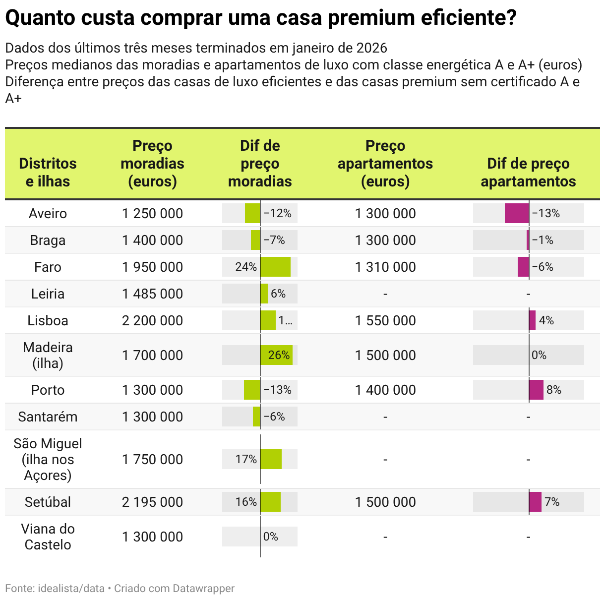 Geral Casas premium com conforto energético: onde há mais e a que preços? Maioria dos apartamentos de luxo têm classificação alta em quase todos os distritos e ilhas. Já com as moradias é diferente. 24 fev 2026 min de leitura Hoje, as casas de luxo não têm apenas uma localização premium, um design sofisticado ou acabamentos de topo. Este conceito tem vindo a evoluir, com a sustentabilidade e o conforto a assumirem um papel central na hora de comprar uma habitação de gama alta. Mas quem procura uma casa de luxo com alta eficiência energética em Portugal vai deparar-se com um mercado heterogéneo a nível geográfico. Enquanto a maioria dos apartamentos de luxo têm alta classificação energética em quase todos os distritos e ilhas portuguesas analisadas, o mesmo não acontece quando olhamos para as moradias, tal como revela esta análise do idealista. Há mais de 6 mil anúncios de casas de luxo para comprar no idealista (moradias e apartamentos) com certificado energético A ou A+, a classificação mais elevada de todas. E é em Lisboa, no Porto, em Faro, na ilha da Madeira e em Setúbal onde se concentra a maior fatia da oferta destas residências eficientes que custam mais de um milhão de euros, segundo mostram os dados do idealista/data relativos ao último trimestre terminado em janeiro de 2026. Olhando para o stock total casas de luxo à venda com certificado energético anunciadas no portal, verificam-se grandes diferenças entre moradias e apartamentos: Moradias: a oferta de luxo com alta eficiência energética representa menos de metade do stock premium em quase todos os distritos e ilhas, incluindo Lisboa (34% do total) e o Porto (35%). Só mesmo na ilha da Madeira é que a maioria das moradias premium têm certificado energético A ou A+ (62%); Apartamentos: pelo contrário, a oferta de apartamentos de luxo com alta eficiência energética é dominante em praticamente todos os territórios analisados e com amostras representativas, como é o caso de Braga, Setúbal, Aveiro, Porto, ilha da Madeira e Faro. A única exceção é o distrito de Lisboa, onde apenas 44% do stock premium tem a classificação energética máxima. Note-se que nesta análise apenas se têm em conta os anúncios de casas de luxo à venda no idealista (novas e existentes) que indicaram a categoria do certificado energético, requisito obrigatório na hora de vender ou arrendar casa em Portugal, inclusive no segmento de luxo. Aliás, na construção de casas novas é indispensável obter este tipo de certificação. Como, hoje, os promotores e construtores têm de cumprir elevados padrões de eficiência, a grande maioria dos novos edifícios habitacionais concluídos têm classe A e A+, tal como se pode aferir a partir dos dados públicos do Sistema de Certificação Energética dos Edifícios. Casas de luxo eficientes: onde há mais? Dados dos últimos três meses terminados em janeiro de 2026 % de casas de luxo com certificado energético A e A+ face ao stock total premium em cada território Table with 3 columns and 11 rows. (column headers with buttons are sortable) Distritos e ilhas Oferta moradias Oferta apartamentos Aveiro 31% 31% 31% 73% 73% 73% Braga 38% 38% 38% 84% 84% 84% Faro 36% 36% 36% 58% 58% 58% Leiria 40% 40% 40% - Lisboa 34% 34% 34% 44% 44% 44% Madeira (ilha) 62% 62% 62% 61% 61% 61% Porto 35% 35% 35% 71% 71% 71% Santarém 17% 17% 17% - São Miguel (ilha nos Açores) 41% 41% 41% - Setúbal 38% 38% 38% 82% 82% 82% Viana do Castelo 20% 20% 20% - Alta eficiência energética valoriza habitação de luxo: onde? A sustentabilidade e alta eficiência energética são fatores que podem ajudar a valorizar e a diferenciar ainda mais uma habitação premium. Mas será que mexe diretamente com o preço das casas de luxo à venda no mercado? Não há uma resposta única a esta questão, até porque pesam distintos fatores na avaliação de um imóvel. O que se pode dizer é que há distritos e ilhas onde os apartamentos e moradias de luxo com alta eficiência energética são bem mais caros do que os que têm uma classificação mais baixa (inferior a A), tendo em conta os mesmos dados do idealista/data relativos aos últimos três meses terminados em janeiro passado: As moradias de luxo eficientes têm preços mais elevados do que as não eficientes em seis dos 11 distritos e ilhas analisadas. Na ilha da Madeira e em Faro, a diferença de preços chega a ser superior a 20% a favor da sustentabilidade ambiental. Em Lisboa é de 12%; Também há três distritos onde os apartamentos de luxo eficientes são mais caros do que os não eficientes (Porto, Setúbal e Lisboa), embora apresentem diferenças menos acentuadas, de apenas um dígito. Mas o contrário também acontece. Ou seja, há habitações premium com alto conforto energético que apresentam preços inferiores aos das casas de luxo com classe energética mais baixa (como B, B-, C, D, E ou até F). A maior diferença de preços no caso das moradias foi detetada no Porto (-13%) e no caso dos apartamentos em Aveiro (-13%). Isto pode dever-se ao facto destas casas, apesar de não terem alta eficiência, possuírem outras características de luxo que elevam o seu valor, como grandes áreas, comodidades, localização, zonas exteriores, etc. Quanto custa comprar uma casa premium eficiente? Dados dos últimos três meses terminados em janeiro de 2026 Preços medianos das moradias e apartamentos de luxo com classe energética A e A+ (euros) Diferença entre preços das casas de luxo eficientes e das casas premium sem certificado A e A+ Table with 5 columns and 11 rows. (column headers with buttons are sortable) Distritos e ilhas Preço moradias (euros) Dif de preço moradias Preço apartamentos (euros) Dif de preço apartamentos Aveiro 1 250 000 −12% −12% −12% 1 300 000 −13% −13% −13% Braga 1 400 000 −7% −7% −7% 1 300 000 −1% −1% −1% Faro 1 950 000 24% 24% 24% 1 310 000 −6% −6% −6% Leiria 1 485 000 6% 