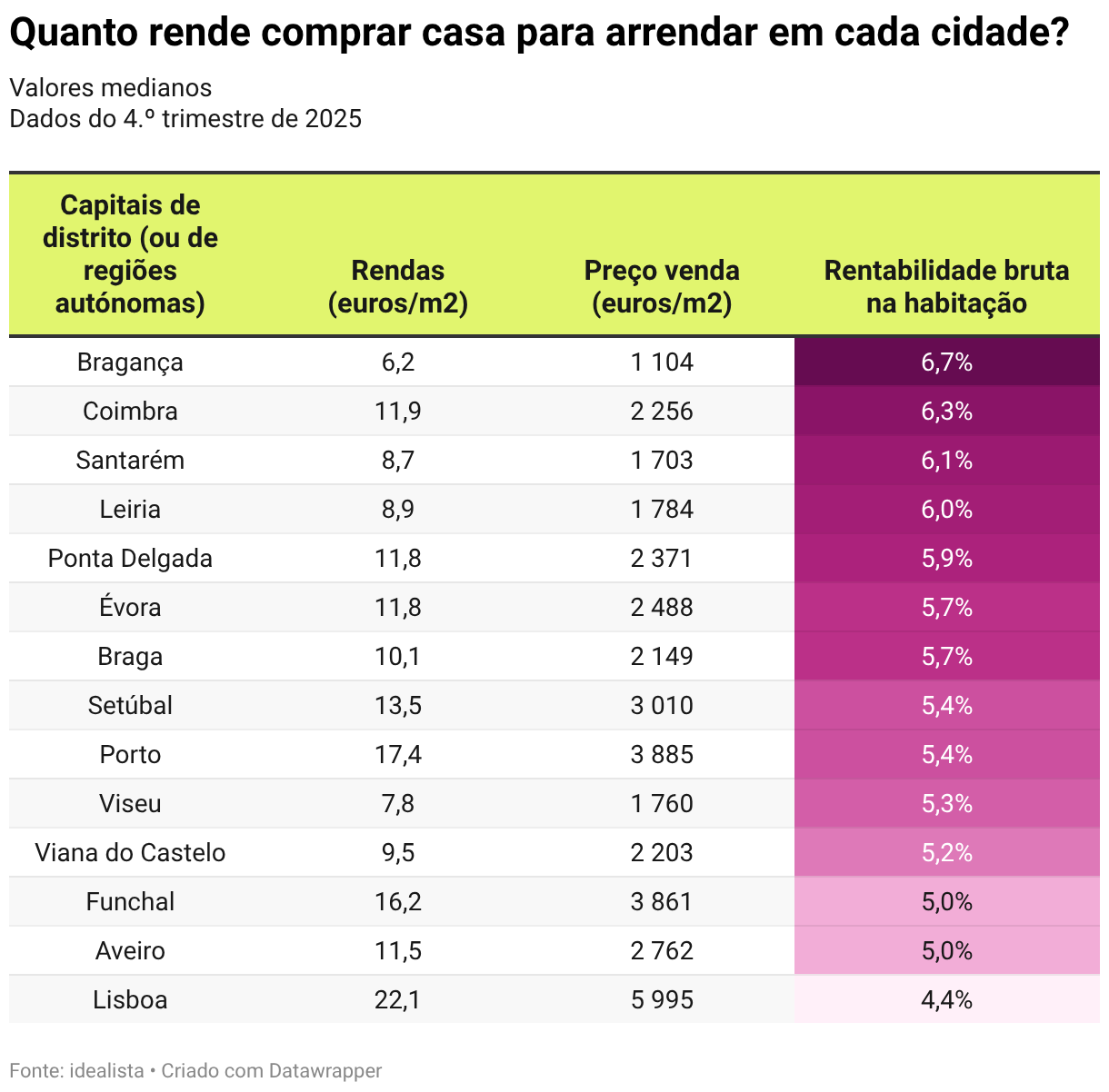 Entre as capitais de distrito e ilhas analisadas, Bragança foi a cidade mais rentável para investir em habitação, com uma rentabilidade de 6,7%, seguida de Coimbra (6,3%), Santarém (6,1%), Leiria (6,0%) e Ponta Delgada (5,9%). Mas nestas cidades também há maiores riscos de investir, podendo haver maior dificuldade de arrendar casa ou de haver uma valorização do imóvel no futuro.