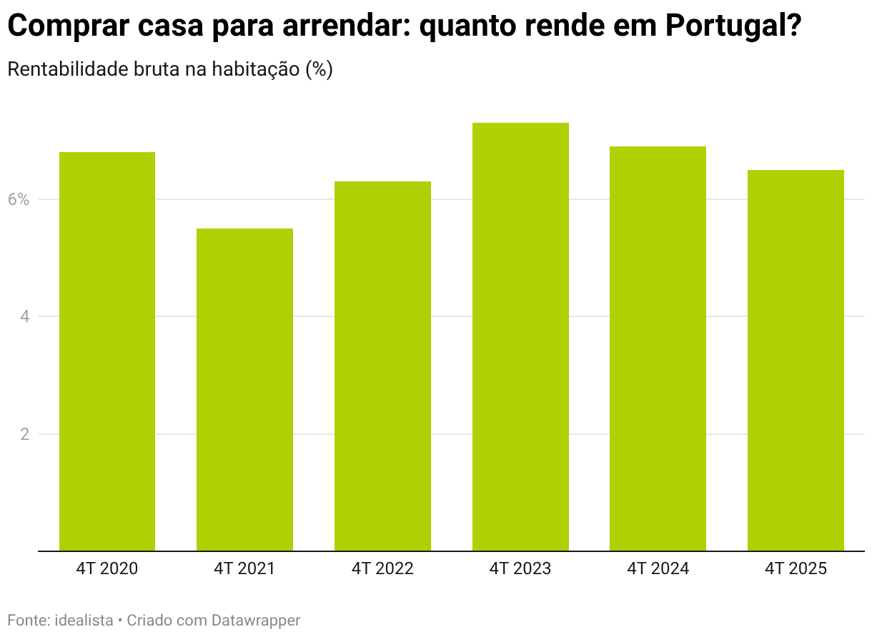 Uma das soluções para resolver a crise de acesso à habitação em Portugal passa por estimular o mercado de arrendamento, aumentando a oferta, tal como reconhece o Governo. E uma forma de o fazer passa por comprar casas e colocá-las a arrendar, um tipo de negócio que pode ser bem atrativo quer para investidores, quer para famílias endinheiradas. Isto porque a compra de casa para arrendar em Portugal apresentou uma rentabilidade bruta de 6,5% no quarto trimestre de 2025, de acordo com os dados do idealista. E este investimento na habitação apresenta menos riscos face ao final de 2024.