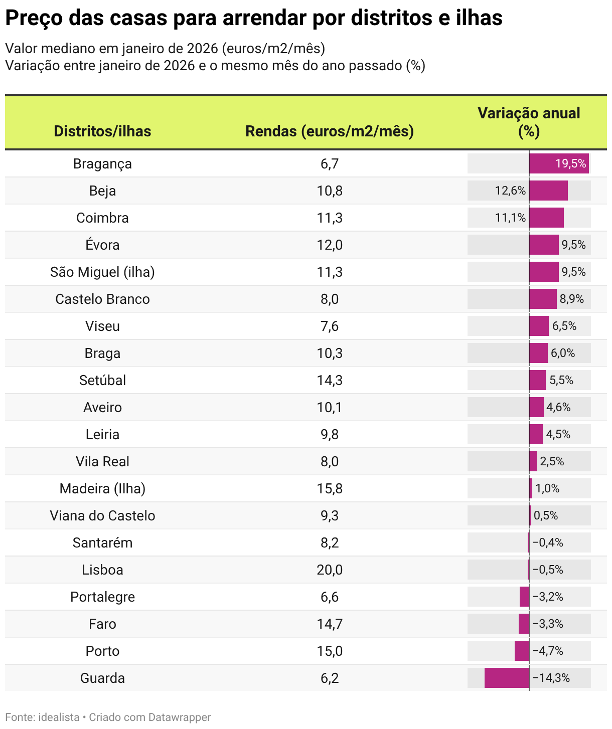 Geral Rendas das casas descem 1,9% em janeiro – estão em queda há 3 meses Casas para arrendar 6,4% mais caras no Centro. Mas preços estão em queda no Norte e no Algarve, revela idealista. 03 fev 2026 min de leitura O início de 2026 trouxe novidades para o mercado de arrendamento. As rendas das casas em Portugal desceram 1,9% em janeiro face ao mesmo mês do ano anterior, num contexto de elevada procura, o que sugere que houve um crescimento da oferta de casas para arrendar no último ano, tendo em conta a lei da oferta e da procura. Assim, de acordo com o índice de preços do idealista, arrendar casa passou a ter o custo mediano de 16,1 euros por metro quadrado (euros/m2) no final de janeiro, afastando-se do máximo histórico de 17 euros/m2 registado em outubro de 2025. Esta tendência de descida das rendas das casas tem-se vindo a observar nos últimos três meses, com a variação trimestral a situar-se em -5,3%. Preço das casas para arrendar sobe em 11 grandes cidades apesar de queda nacional Embora se tenha sentido uma ligeira correção do custo do arrendamento a nível nacional, a verdade é que em 11 grandes cidades sentiram-se crescimentos nas rendas. As maiores subidas anuais das rendas das casas foram registadas em Setúbal (11,9%), Leiria (11,3%) e Viana do Castelo (11,1%). Também houve aumento nos preços do arrendamento habitacional em Faro (9,7%), Ponta Delgada (9,7%), Coimbra (9,3%), Santarém (7,1%), Viseu (6,3%), Braga (2%), Funchal (1,3%) e Aveiro (0,6%), mostram os dados do idealista. Em sentido contrário, registaram-se descidas anuais nas rendas em Castelo Branco (-2,1%) e no Porto (-6,3%). Já em Lisboa, os preços mantiveram-se praticamente estáveis (-0,5%). Lisboa continua a ser a cidade mais cara para arrendar casa, com um preço mediano de 21,8 euros/m2, seguida do Porto (16,7 euros/m2) e do Funchal (16 euros/m2). Logo depois surgem Faro (14,8 euros/m2), Setúbal (13,9 euros/m2), Coimbra (12,3 euros/m2), Aveiro (11,4 euros/m2) e Ponta Delgada (11,1 euros/m2). No segmento intermédio de preços das casas para arrendar estão Braga (10,1 euros/m2), Viana do Castelo (9,5 euros/m2), Santarém (9,5 euros/m2) e Leiria (8,9 euros/m2). As capitais de distrito mais económicas continuam a ser Viseu (7,8 euros/m2) e Castelo Branco (6,7 euros/m2). Preço das casas para arrendar por grandes cidades Valor mediano em janeiro de 2026 (euros/m2/mês) Variação entre janeiro de 2026 e o mesmo mês do ano passado (%) Table with 3 columns and 14 rows. (column headers with buttons are sortable) Capitais de distrito/regiões autónomas Rendas (euros/m2/mês) Variação anual (%) Setúbal 13,9 11,9% 11,9% 11,9% Leiria 8,9 11,3% 11,3% 11,3% Viana do Castelo 9,5 11,1% 11,1% 11,1% Ponta Delgada 11,1 9,7% 9,7% 9,7% Faro 14,8 9,7% 9,7% 9,7% Coimbra 12,3 9,3% 9,3% 9,3% Santarém 9,5 7,1% 7,1% 7,1% Viseu 7,8 6,3% 6,3% 6,3% Braga 10,1 2,0% 2,0% 2,0% Funchal 16,0 1,3% 1,3% 1,3% Aveiro 11,4 0,6% 0,6% 0,6% Lisboa 21,8 −0,5% −0,5% −0,5% Castelo Branco 6,7 −2,1% −2,1% −2,1% Porto 16,7 −6,3% −6,3% −6,3% Fonte: idealistaDescarregar estes dadosIncorporar Descarregar imagemCriado com Datawrapper Distritos da Guarda, Porto e Faro com quedas nas rendas Nos últimos 12 meses, os preços das casas para arrendar subiram em 13 dos 20 distritos e ilhas analisados, mantiveram-se praticamente estáveis em Viana do Castelo (0,5%), Lisboa (-0,5%) e Santarém (-0,4%) e desceram em quatro territórios. A maior subida anual das rendas das casas registou-se em Bragança (19,5%), seguida de Beja (12,6%), Coimbra (11,1%), Évora (9,5%) e da ilha de São Miguel (9,5%). Registaram-se ainda aumentos em Castelo Branco (8,9%), Viseu (6,5%), Braga (6%), Setúbal (5,5%), Aveiro (4,6%), Leiria (4,5%), Vila Real (2,5%) e na ilha da Madeira (1%). Em sentido contrário, as maiores descidas anuais do custo de arrendar casa observaram-se na Guarda (-14,3%), no Porto (-4,7%), em Faro (-3,3%) e em Portalegre (-3,2%), indica o idealista. Lisboa lidera o ranking dos distritos e ilhas mais caras para arrendar casa, com um preço mediano de 20 euros/m2, seguida da ilha da Madeira (15,8 euros/m2) e do Porto (15 euros/m2). Logo depois surgem Faro (14,7 euros/m2) e Setúbal (14,3 euros/m2). Com valores das rendas acima dos 10 euros/m2 encontram-se ainda Évora (12 euros/m2), Coimbra (11,3 euros/m2), a ilha de São Miguel (11,3 euros/m2), Beja (10,8 euros/m2), Braga (10,3 euros/m2) e Aveiro (10,1 euros/m2). No segmento intermédio surgem Leiria (9,8 euros/m2), Viana do Castelo (9,3 euros/m2), Santarém (8,2 euros/m2), Castelo Branco (8 euros/m2) e Vila Real (8 euros/m2). Os distritos mais económicos para arrendar uma habitação continuam a ser Viseu (7,6 euros/m2), Bragança (6,7 euros/m2), Portalegre (6,6 euros/m2) e a Guarda (6,2 euros/m2). Preço das casas para arrendar por distritos e ilhas Valor mediano em janeiro de 2026 (euros/m2/mês) Variação entre janeiro de 2026 e o mesmo mês do ano passado (%) Table with 3 columns and 20 rows. (column headers with buttons are sortable) Distritos/ilhas Rendas (euros/m2/mês) Variação anual (%) Bragança 6,7 19,5% 19,5% 19,5% Beja 10,8 12,6% 12,6% 12,6% Coimbra 11,3 11,1% 11,1% 11,1% Évora 12,0 9,5% 9,5% 9,5% São Miguel (ilha) 11,3 9,5% 9,5% 9,5% Castelo Branco 8,0 8,9% 8,9% 8,9% Viseu 7,6 6,5% 6,5% 6,5% Braga 10,3 6,0% 6,0% 6,0% Setúbal 14,3 5,5% 5,5% 5,5% Aveiro 10,1 4,6% 4,6% 4,6% Leiria 9,8 4,5% 4,5% 4,5% Vila Real 8,0 2,5% 2,5% 2,5% Madeira (Ilha) 15,8 1,0% 1,0% 1,0% Viana do Castelo 9,3 0,5% 0,5% 0,5% Santarém 8,2 −0,4% −0,4% −0,4% Lisboa 20,0 −0,5% −0,5% −0,5% Portalegre 6,6 −3,2% −3,2% −3,2% Faro 14,7 −3,3% −3,3% −3,3% Porto 15,0 −4,7% −4,7% −4,7% Guarda 6,2 −14,3% −14,3% −14,3% Fonte: idealistaDescarregar estes dadosIncorporar Descarregar imagemCriado com Datawrapper Região Norte e Algarve com correções nos preços do arrendamento Nos últimos 12 meses, os preços das casas para arrendar subiram em quatro da